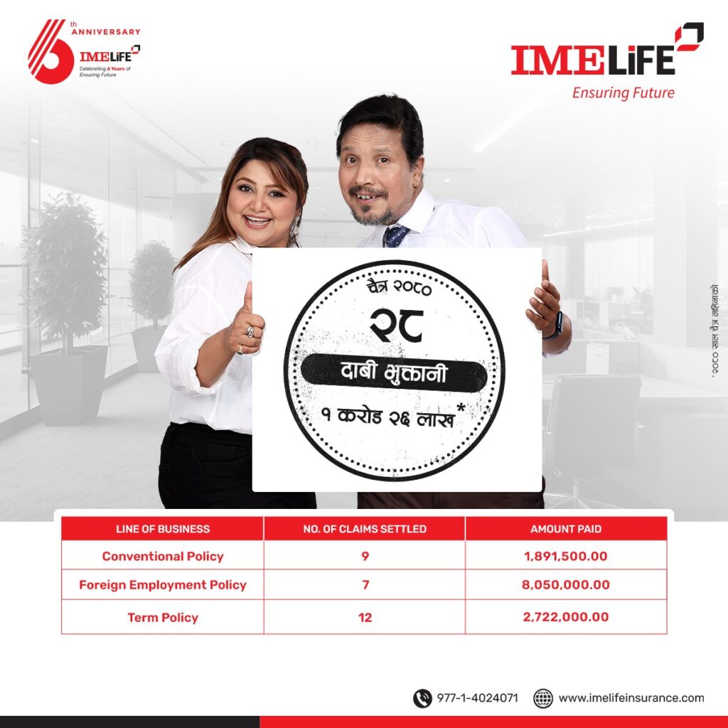 आईएमई लाइफ इन्स्योरेन्सले गर्यो चैत महिनामा १ करोड २६ लाख दाबी भुक्तानी