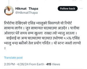 वाईवाई वा अन्य चाउचाउमा चाउचाउ उधोगमा ०.५% एसिड भ्यालु भन्दा बढीको तेल प्रयोग गरिदैन । यो स्टन्ट जस्तो लाग्यो ।— Hikmat Thapa (@HikmatThapa) April 26, 2024