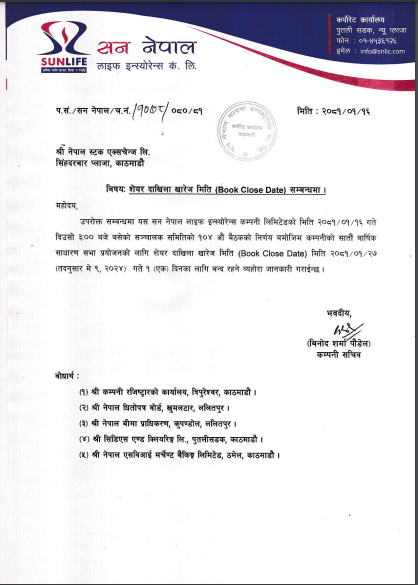 काठमाडौं । सन नेपाल लाइफ इन्स्योरेन्स कम्पनी लिमिटेडले कम्पनीको ७औं वार्षिक साधारणसभा जेठ ९ गते अमृतभोग केटरर्स प्रालि, कालिकास्थानमा बस्ने आह्वान गरेको छ । उक्त प्रयोजनका लागि वैशाख २७ गते एक दिन बुक क्लोज गर्ने भएको छ । कम्पनीको वैशाख १६ गते बसेको सञ्ञ्चालक समितिको बैठकको निर्णयअनुसार वैशाख २७ गते बुक क्लोज गर्ने भएको हो ।