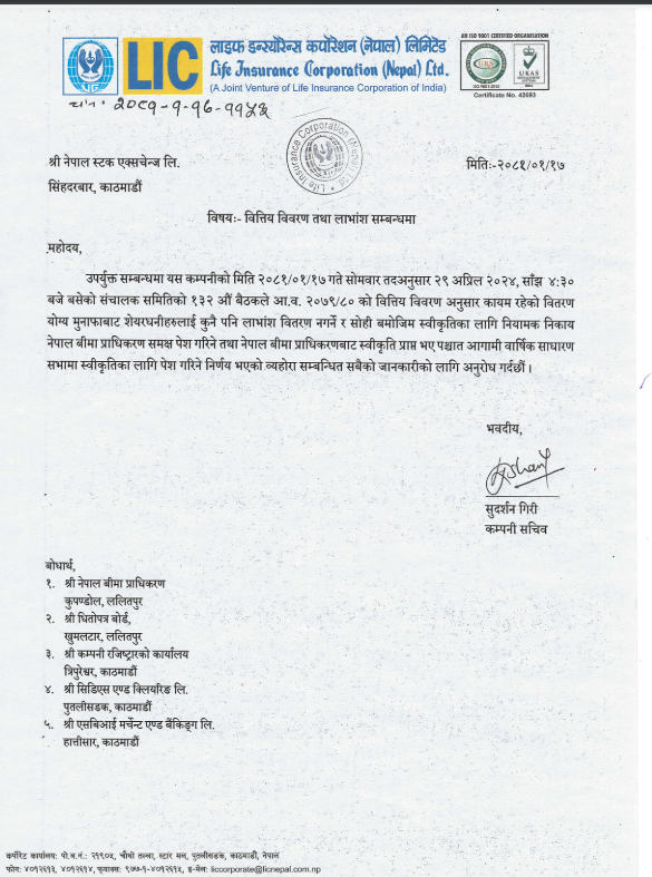 काठमाडौं । गत आर्थिक वर्ष २०७९र८० को मुनाफाबाट एलआइसी नेपालले सेयरधनीलाई लाभांश नदिने भएको छ । कम्पनीको वैशाख १७ गते बसेको सञ्चालक समितिको १३२ औं बैठकको निर्णयअनुसार सेयरधनीलाई लाभांश नदिने निर्णय गरेको हो ।