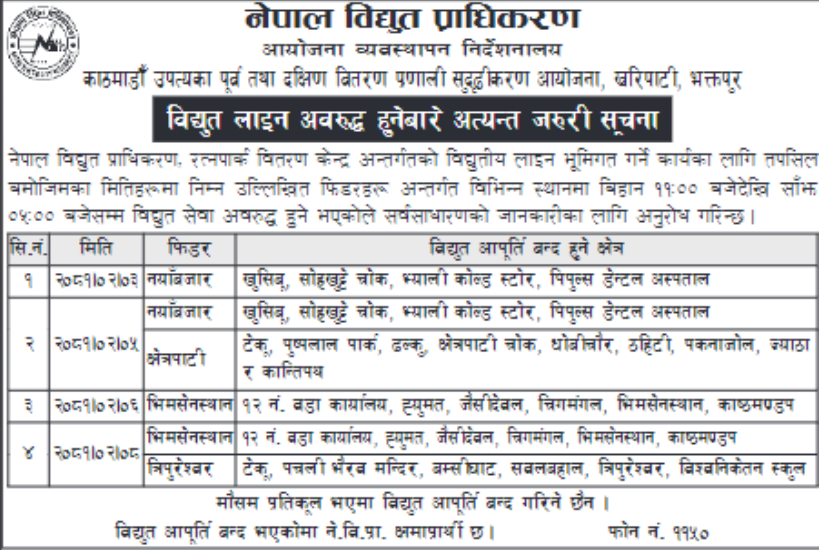 प्राधिकरणका अनुसार नयाँ बजार फिडरमा जेठ ३ गते, नयाँ बजार र क्षेत्रपाटी फिडरमा ५ गते, भीमसेनस्थान फिडरमा ६ गते र भीमसेनस्थान र त्रिपुरेश्वर फिडरका स्थानमा जेठ ८ गते विद्युत अवरुद्ध हुनेछ ।