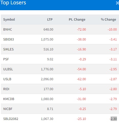 त्यस्तै रिडिपावर कम्पनी लिमिटेडको २.८० प्रतिशत, कालिका लघुवित्त वित्तीय संस्थाको २.७९ प्रतिशत, एनआईसी एसिया ब्यालेन्स फण्डको २.७९ र एसबीएल डिभेन्चर २०८२ को सेयर मूल्यमा २.३० प्रतिशतले गिरावट आएको छ ।
