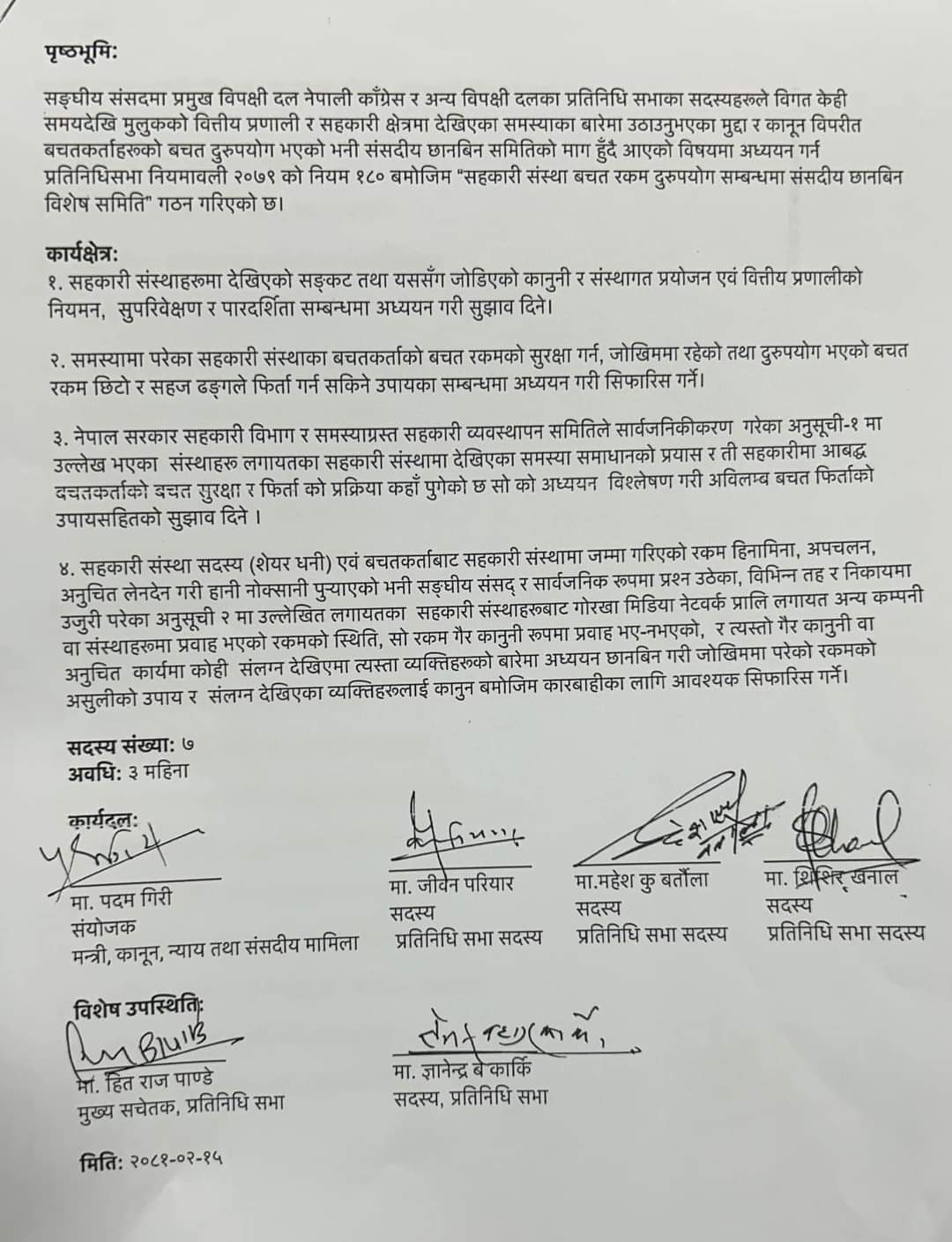 काठमाडौं । सहकारीको बचत रकम अपचलन प्रकरणमा बनाइने संसदीय छानबिन समितिको कार्यादलमा चारबुँदे सहमति भएको छ । मंगलबार दिउँसो कानुन न्याय तथा संसदीय मामिला मन्त्रालयमा बसेको कार्यदलको बैठकले कार्यादेशको टुंगो लगाएको हो ।