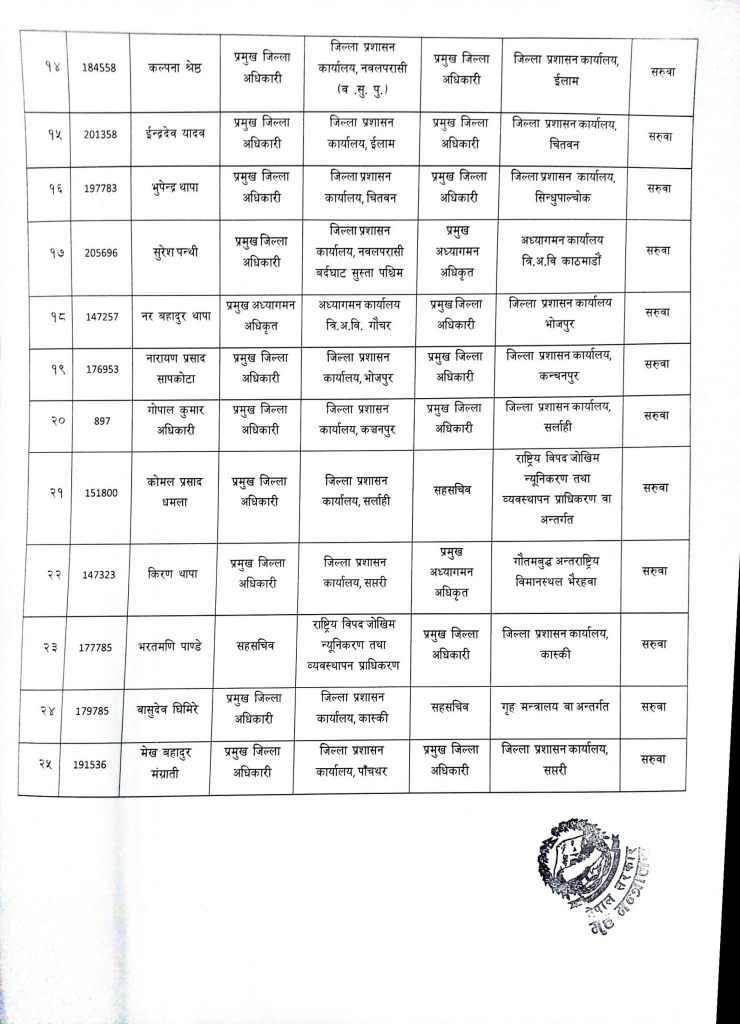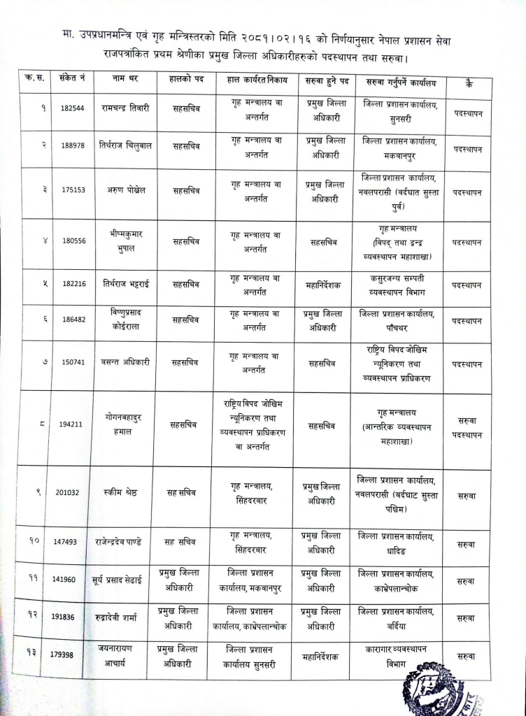 गृहका रामचन्द्र तिवारीलाई सुनसरीको प्रजिअ, तीर्थराज सिलवाललाई मकवानपुरको प्रजिअ, विष्णुप्रसाद कोइरालालाई पाँचथर, राजेन्द्रदेव पाण्डेलाई धादिङ, सूर्यप्रसाद सेढाइँलाई मकवानपुरबाट काभ्रेपलाञ्चोक, रुद्रादेवी शर्मालाई काभ्रेबाट बर्दियाको प्रजिअमा सरुवा गरिएको छ।