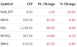 धेरै घट्ने कम्पनीको शिर्ष ५ भित्र परेको अर्को कम्पनी हो राप्ती हाइड्रो एन्ड जनरल कन्स्ट्रक्सन लिमिटेड हो । यो कम्पनीको सेयर मूल्य सेयर मूल्यमा ४.१२ प्रतिशत अर्थात् १४ रुपैयाँ ९० पैसाले घटेर ३४७ रुपैयाँमा कारोबार बन्द भएको छ । त्यस्तै सोमबार सुपर मादी हाइड्रोपावर लिमिटेडको सेयर मूल्य पनि ३.९० प्रतिशतले घटेको छ । यो कम्पनीको २१ रुपैयाँले घटेर ५१८ रुपैयाँमा कारोबार बन्द भएको छ ।