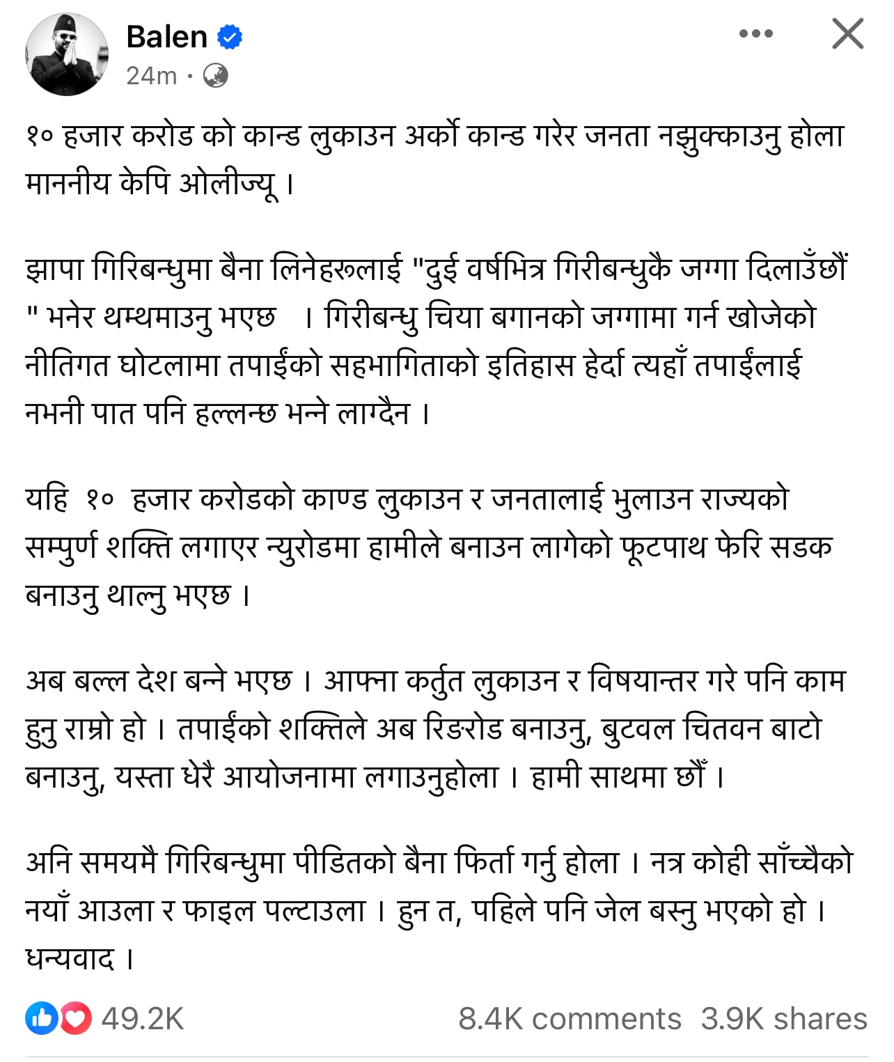 काठमाडौं । काठमाडौं महानगरका मेयर बालेन शाहले नेकपा एमाले अध्यक्ष केपी शर्मा ओलीले गिरीबन्धु टी–स्टेट जग्गा प्रकरणलाई विषयान्तर गर्न खोजेको आरोपल लगाएका छन् । सामाजिक सञ्जाल फेसबुकमा लेख्दै मेयर शाहले केपीले १० हजार करोडको काण्ड लुकाउन खोजेको आरोप लगाएका हुन् ।