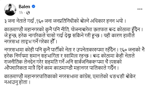 काठमाडौं । काठमाडौं महानगरपालिकाको नगरसभा स्थगित भएपछि मेयर बालेन्द्र शाहले अन्य जनप्रतिनिधिलाई सभामा दलगत धङ्धङी बोकेर नआउन चेतावनी दिएका छन् । सामाजिक सञ्जालमार्फत मेयर साहले नगरसभामा कांग्रेस, एमालेको धङ्धङी बोकेर नआउन आग्रह गरेका हुन् ।