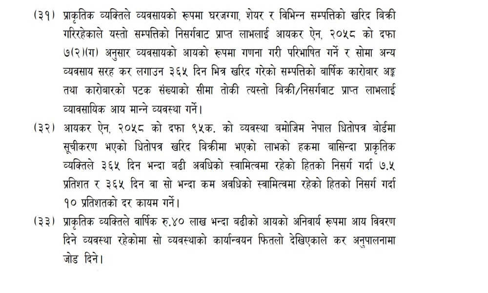 ‘प्राकृतिक व्यक्तिले व्यवसायको रुपमा घरजग्गा, सेयर र विभिन्न सम्पत्तिको खरिदबिक्री गरिरहेकाले त्यस्तो सम्पत्तिको निसर्गबाट प्राप्त लाभलाई आयकर ऐन २०५८ को दफा ७ (२)(ग) अनुसार व्यवसायको आयको रूपमा गणना गर्ने र सो आयमा अन्य व्यवसाय सरह कर लगाउने । साथै, यो प्रयोजनका लागि ३६५ दिनभित्र खरिद गरेको सम्पत्तिको वार्षिक कारोबार अंक तथा कारोबारको पटकको संख्याको सीमा तोकी त्यस्तो बिक्री तथा निसर्गबाट प्राप्त लाभलाई व्यावसायिक आय मान्ने व्यवस्था गर्ने,’ समितिको सुझाव छ ।