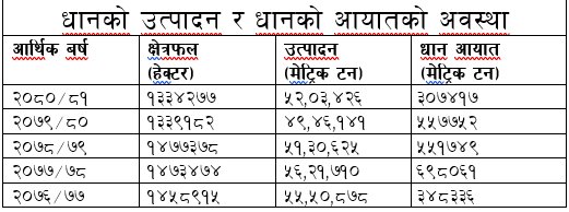 गत आर्थिक वर्षमा पनि सरकारले ५ लाख ५७ हजार ७५२ मेट्रिकटन धान आयात गर्यो । गत वर्ष नेपालमा १३ लाख ३९ हजार १८२ हेक्टर क्षेत्रफलमा धान रोपाइ भएको देखिन्छ । पछिल्लो पाँच वर्षमा सबैभन्दा कम धान उत्पदन पनि गत आर्थिक वर्षमा नै भएको देखिन्छ । गत वर्ष ४९ लाख ४६ हजार १४१ मेट्रिक धान उत्पादन भएको छ ।