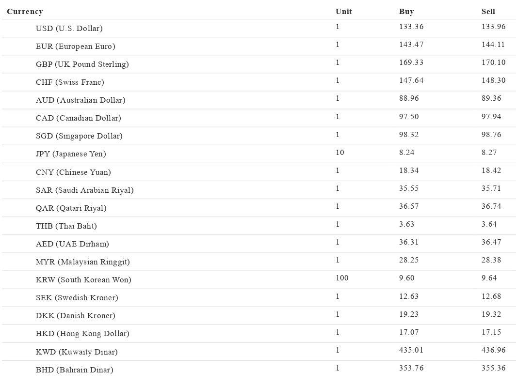 काठमाडौँ । नेपाल राष्ट्र बैंकले बिहीबार लागि विदेशी मुद्राको विनिमय दर सार्वजनिक गरेको छ । बैकका अनुसार आज अमेरिकी डलर एकको खरिददर १३३ रुपैयाँ ३६ पैसा र बिक्रीदर १३३ रुपैयाँ ९६ पैसा कायम छ । साथै यूरोपियन यूरो एकको खरिदर १४३ रुपैयाँ ४७ पैसा र बिक्रीदर १४४ रुपैयाँ ११ पैसा कायम भएको छ ।