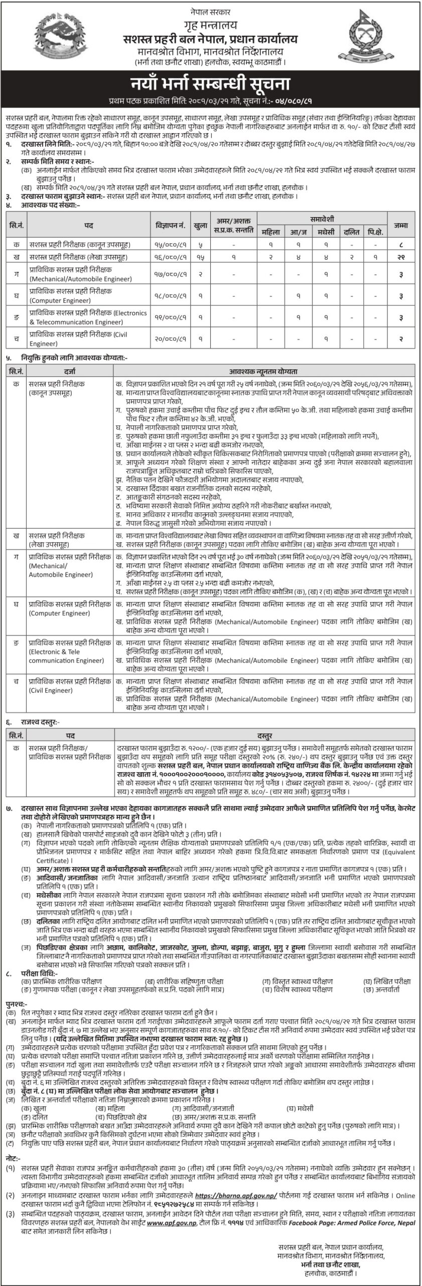 सशस्त्र प्रहरी बलले सशस्त्र प्रहरी निरीक्षकदेखि प्राविधिक सशस्त्र प्रहरी निरीक्षकसम्मको पदहरूमा खुला प्रतियोगिताद्वारा पदपूर्तिका लागि आवेदन माग गरेको हो । योग्यता पुगेका इच्छुक नागरिकले साउन २७ गतेसम्म आवेदन दिन सकिने छ । अनलाइनमार्फत तोकिएको समयभित्र दरखास्त दिन सकिनेछ ।