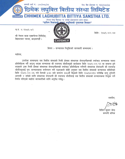 काठमाडौं । छिमेक लघुवित्त वित्तीय संस्था लिमिटेडको सञ्चालकमा रामचन्द्र जोशी पुनः नियुक्त भएका छन् । संस्थाको साउन ६ गते बसेको सञ्चालक समितिको बैठकको निर्णयअनुसार सञ्चालकमा संस्थापक सेयरधनी जोशी पुनः नियुक्त भएका हुन् ।