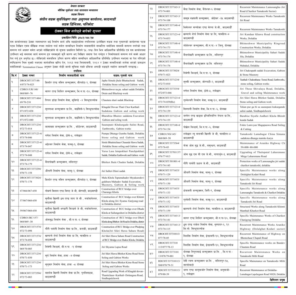 काठमाडौँ । संघीय सडक सुपरीवेक्षण तथा अनुगमन कार्यालय, काठमाडौँ अन्तर्गतको सडक डिभिजन चरिकोटले ठेक्का किन नतोड्ने भन्दै विभिन्न निर्माण कम्पनीलाई स्पष्टीकरण सोधको छ । कार्यालय आज एक सूचनामार्फत काम गर्ने सम्झौता गरी समयमै काम नगर्ने ५२ कम्पनीका नाममा आज सार्वजनिक सूचना जारी गरेको हो ।