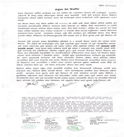 नेपाल सेयरधनी संघ, नेपाल धितोपत्र लगानीकर्ता संघ, जनरल इन्भेस्टर एसोसिएसन र साधारण लगानीकर्ता संघ नेपालले संयुक्त प्रेस विज्ञप्ति जारी गर्दै पुँजी बजारलाई चुस्त पारदर्शी एवं पूर्ण व्यावसायिक बनाउन सके अर्थतन्त्रमा ठूलो योगदान पुग्ने उनीहरुले बताएका छन् ।