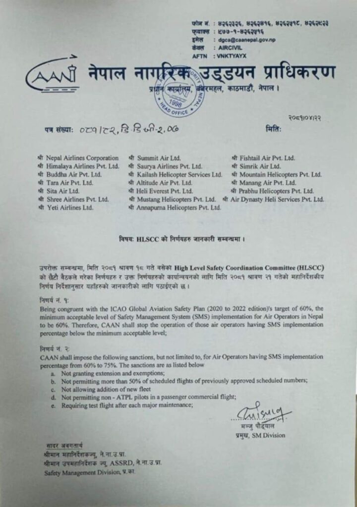 आइकाओ ग्लोबल एभिएसन योजना (२०२० देखि २०२२ संस्करण)को न्यूनतम ६० प्रतिशतको लक्ष्यअनुसार नै नेपालमा हवाई सञ्चालकको न्यूनतम स्वीकार्य सुरक्षा व्यवस्थापन प्रणाली (एसएमएस) कार्यान्वयन गर्र्न लागिएको हो । क्यानले सोभन्दा कम परिपालनादर भएका विमान कम्पनीको उडानमा रोक लगाउने निर्णय गरेको हो ।