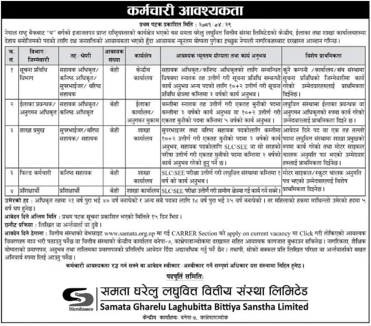 कम्पनीले सूचना विभाग, इलाका प्रबन्धक, अनुगमन अधिकृत, शाखा प्रमुख, फिल्ड कर्मचारी र प्रशिक्षार्थी लगायतका पदहरुमा कर्मचारी माग गरेको छ । उक्त पदन आवेदन दिनको लागि उम्मेदवारले एसएलसी तथा एसइइदेखि सम्बन्धित विषयमा स्नातकसम्मको शैक्षिक योग्यता हासिल गरेको हुनुपर्ने छ ।