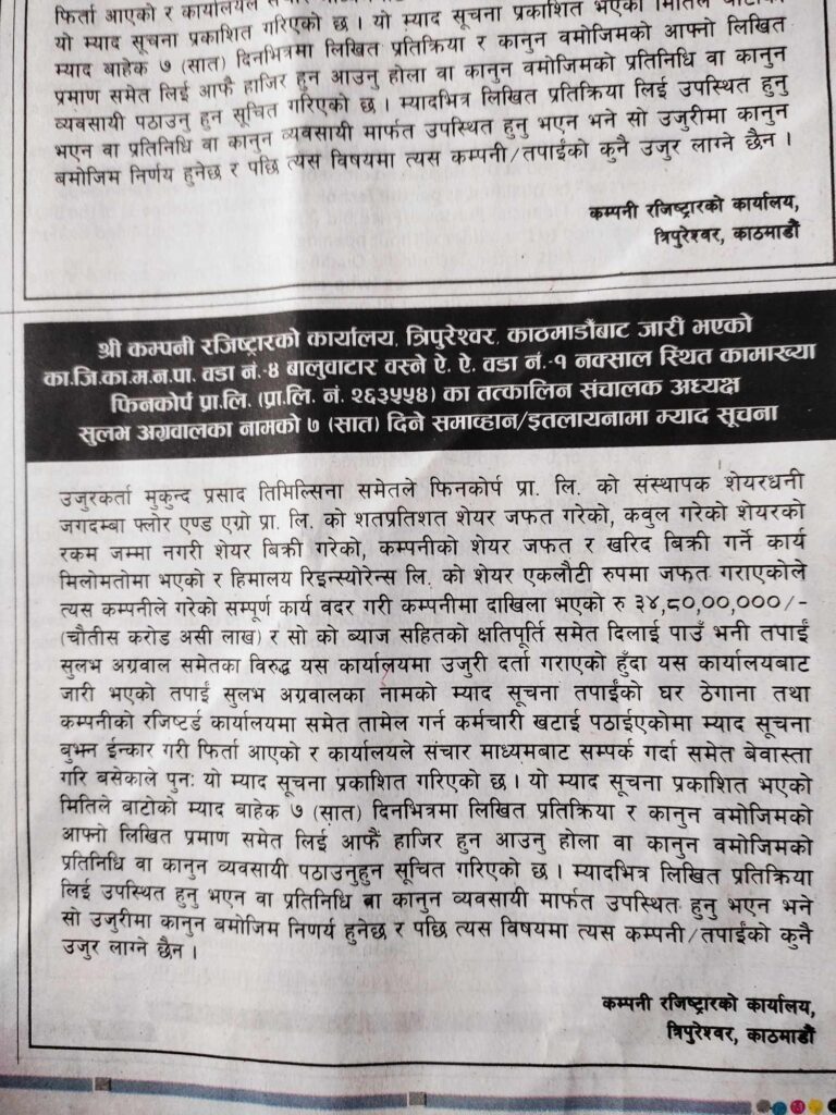 कम्पनी रजिष्ट्रारको कार्यालयले सुलभ अग्रवाललाई ७ दिनभित्र रजिष्ट्रारको कार्यालयमा उपस्थित उनको लागि बुधबार सार्वजनिक सूचना निकालेको छ ।