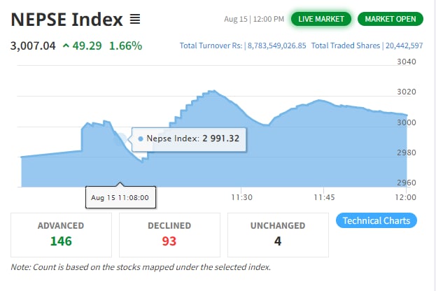 यो समाचार तयारपार्दासम्म नेप्से ४९ दशमलव २९ अंक बढेर ३००७ दशमलव ०४ विन्दुमा पुगेको छ । त्यस्तै कारोबार रकममा पनि उच्च वृद्धि देखिएको छ । यो समाचार तयारपार्दासम्म सेयर बजारमा ८ अर्ब ७८ करोड बढीको कारोबार भएको छ ।