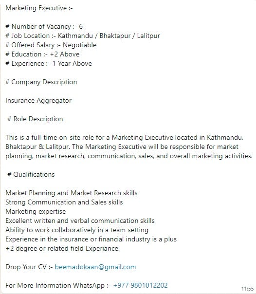 काठमाडौं । बीमा दोकानले काठमाडौं, भक्तपुर र ललितपुर जिल्लाका लागि मार्केटिङ एक्सक्यूटीभ (बजार प्रतिनिधि) पदमा रोजगारीको अवसर खुलाएको छ । संस्थाले आज एक सूचना जारी गर्दै उक्त पदमा ६ जना कर्मचारी माग गरेको हो ।