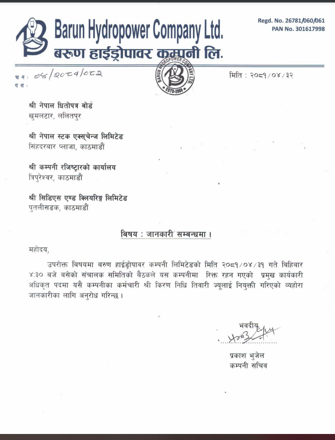 काठमाडौं । बरुण हाइड्रोपावर कम्पनी लिमिटेडले प्रमुख कार्याकारी अधिकृतमा किरण निधिलाई नियुक्ति गरेको छ ।