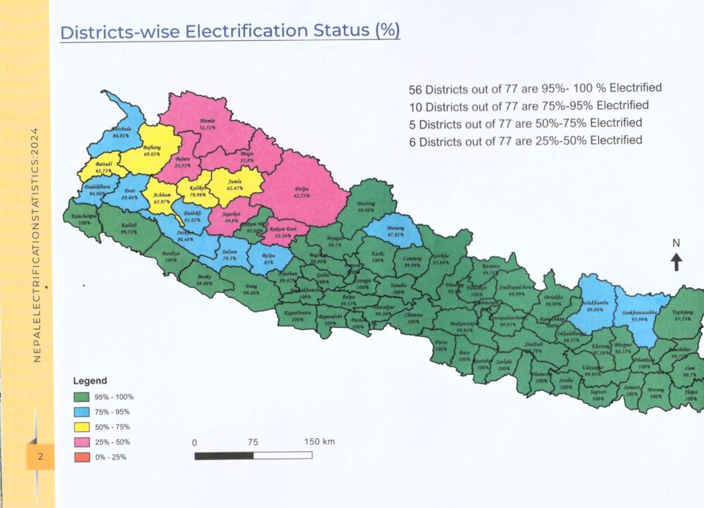 ७७ जिल्लामध्ये हुम्लामा अझै राष्ट्रिय प्रसारण ग्रिड पुग्न सकेको छैन । हुम्लामा लघुजलविद्युत, सौर्य ऊर्जालगायतका विद्युत् आपूर्ति भइरहेको छ । ७७ जिल्लामध्ये ५६ जिल्लामा ९५ देखि शत्प्रतिशत विद्युतीकरण भएको छ । १० जिल्लामा ७५–९५ प्रतिशतसम्म, ५ जिल्लामा ५०–७५ प्रतिशतसम्म र ६ जिल्लामा २५–५० प्रतिशतसम्म विद्युतीकरण गरिएको छ ।