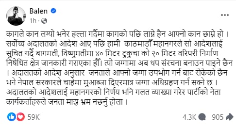 मेयर बालेनले त्यही घटनालाई इंकित गर्दै सामाजिक सञ्जालमार्फत भ्रम छरेको बताएका हुन् । सर्वोच्च अदालतको आदेशलाई महानगरको निर्णय भन्दै गलत व्याख्या गरिएको उनले उल्लेख गरेका छन् ।
