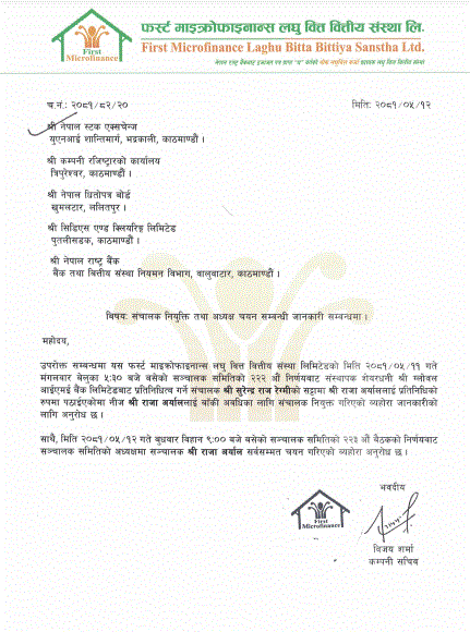 काठमाडौं । फर्स्ट माइक्रोफाइनान्स लघुवित्त वित्तीय संस्थाको भदौ ११ बसेको सञ्चालक समितिको बैठकको निर्णयअनुसार सञ्चालक समितिको अध्यक्षमा राजा अर्याल नियुक्त भएका छन् ।