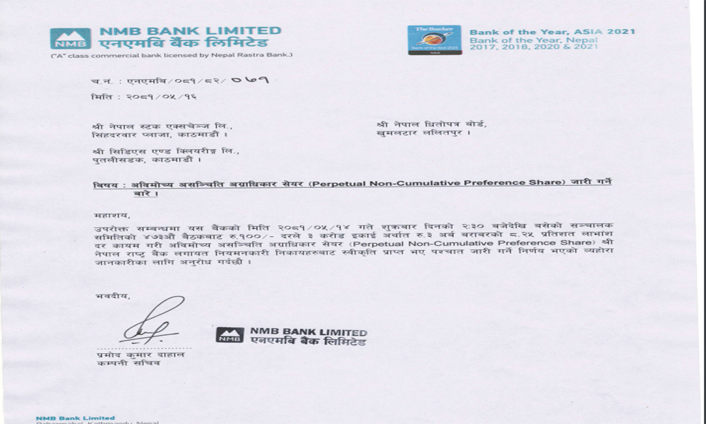 एनएमबि बैंकले अग्राधिकार सेयर जारी गर्ने