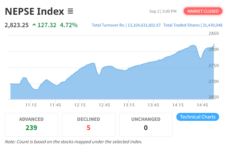 आज सेयर बजारमा हरियाली छायको छ । आज नेपाल स्टक एक्सचेञ्ज (नेप्से) १२७.३२ अंकले बढेर २८२३.२५ को बिन्दुमा पुगेर बजार बन्द भएको छ । त्यस्तै, आज सेन्सेटिभ इण्डेक्स २२.९४ अंक बढेको छ भने फ्लोट इण्डेक्स ९.०२ अंक र सेन्सेटिभ फ्लोट इण्डेक्स ८.१८ अंकले बढेको छ।