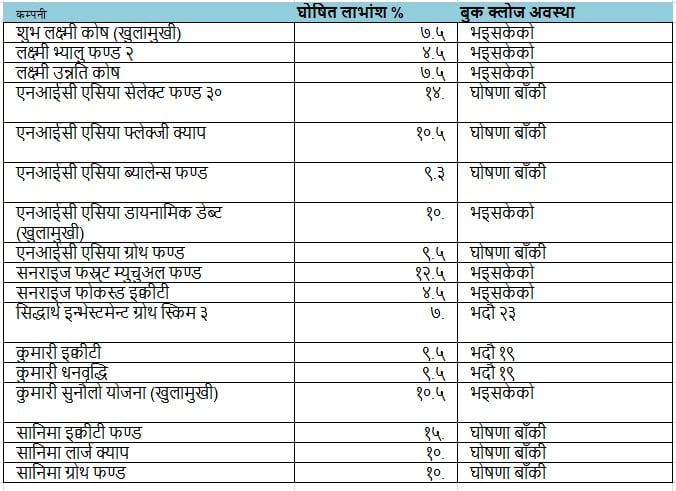 हालसम्म एनआईसी एसिया बैंक, लक्ष्मी सनराइज बैंक, सानिमा बैंक र कुमारी बैंकद्वारा प्रवर्द्धन गरिएका योजनाले लाभांश घोषणा गरेका छन् । उनीहरुले ४.५ देखि १५ प्रतिशतसम्म लाभांश घोषणा गरेका छन् । हालसम्म शुभलक्ष्मी कोष (खुलामुखी), लक्ष्मी उन्नति कोष, एनआईसी एसिया सेलेक्ट फण्ड ३०, एनआईसी एसिया फ्लेक्जी क्याप, एनआईसी एसिया ब्यालेन्स फण्ड, एनआईसी एशिया डायनामिक डेब्ट( खुलामुखी), एनआईसी एशिया ग्रोथ फण्ड, सनराइज फस्त्र्ट म्युचुअल फण्ड र सनराइज फोकस्ड इक्वीटीको लाभांश घोषणा भएको छ ।