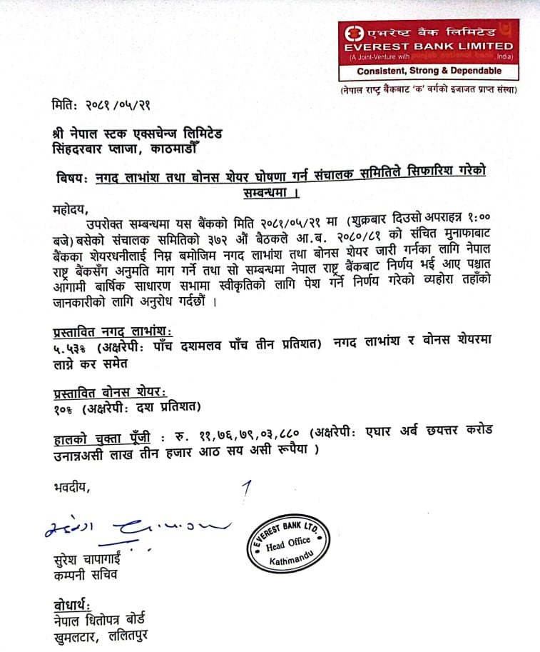 बैंकले १० प्रतिशत बोनस सेयर र ५.५३ प्रतिशत नगद लाभांश दिने निर्णय गरेको हो । उक्त लाभांश नेपाल राष्ट्र बैंकबाट अनुमति पाएपछि आगामी वार्षिक साधारणसभाले पारित गरेपछि सेयरधनीले पाउने छन् । बैंकको चुक्ता पुँजी ११ अर्ब ७६ करोड ७९ लाख ३ हजार ८८० रुपैयाँ रहेको छ ।