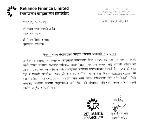 काठमाडौं । रिलायन्स फाइनान्स लिमिटेडले बाह्य लेखापरीक्षक नियुक्त गरेको छ । फाइनान्सको भदौ २० गते सम्पन्न भएको साधारणसभाले सुन्दर एण्ड कम्पनीलाई नियुक्त गरेको हो ।