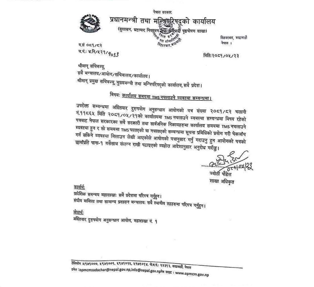 सेवाग्राहीको काम गर्नुपर्नेमा सरकारी कर्मचारी कार्यालय समयमा सेयर बजारमा मात्र रमाउने गरेका थिए । प्रधानमन्त्री केपी शर्मा ओलीको निर्देशनमा देशभरका सरकारी कार्यालयमा टीएमएस नचल्ने निर्देशन दिएको हो । सो अनुसार सरकारी कार्यालयमा अब टीएमएस चल्ने छैन ।