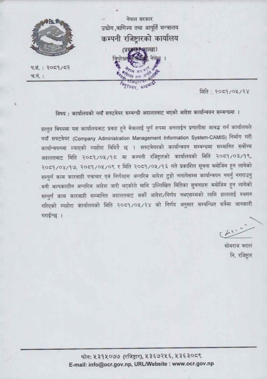 भदौ २४ गते सोमबार एक सूचना प्रकाशित गर्दै कम्पनी रजिस्ट्रारको कार्यालयले कार्यालयको नयाँ सफ्टवेयरसम्बन्धी अदालतबाट भएको आदेश कार्यान्वयन गर्नुपर्ने कारण देखाउँदै कम्पनी दर्ता सेवा स्थगित गरेको हो ।