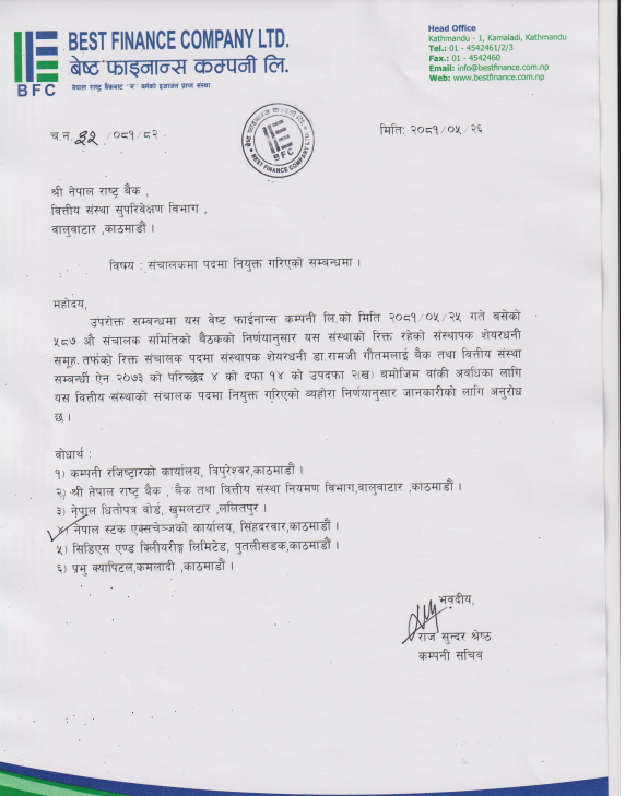काठमाडौं । बेष्ट फाइनान्स लिमिटेडले रिक्त रहेको सञ्चालक नियुक्ति गरेको छ ।