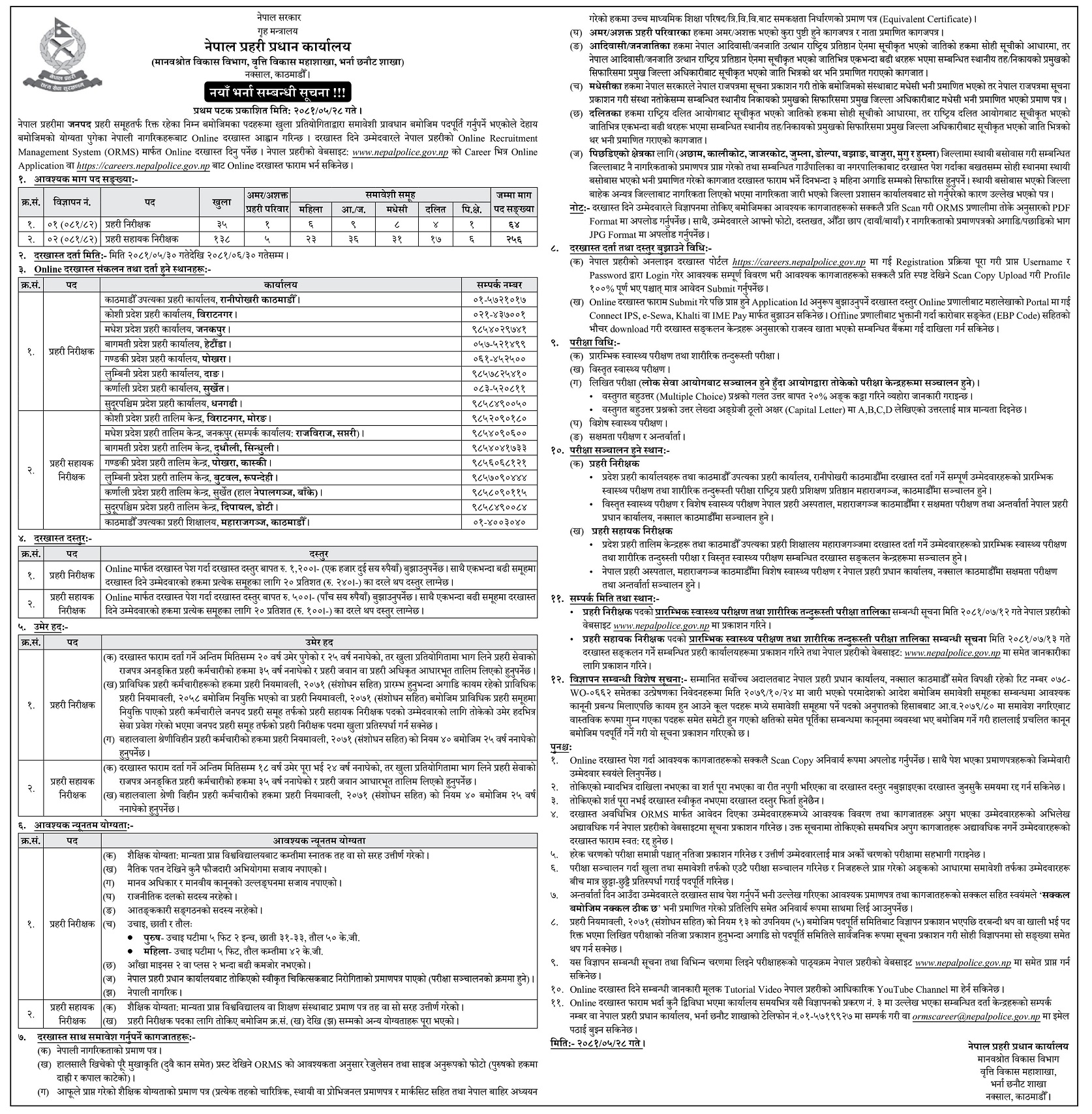 आज  एक सूचना जारी गर्दै शाखाले प्रहरी निरीक्षकमा ६४ जना र प्रहरी सहायक निरीक्षक पदमा २ सय ५६ जना नियुक्ति गर्नुपर्ने भएकाले दरखास्त आह्वान गरेको जनाएको छ ।