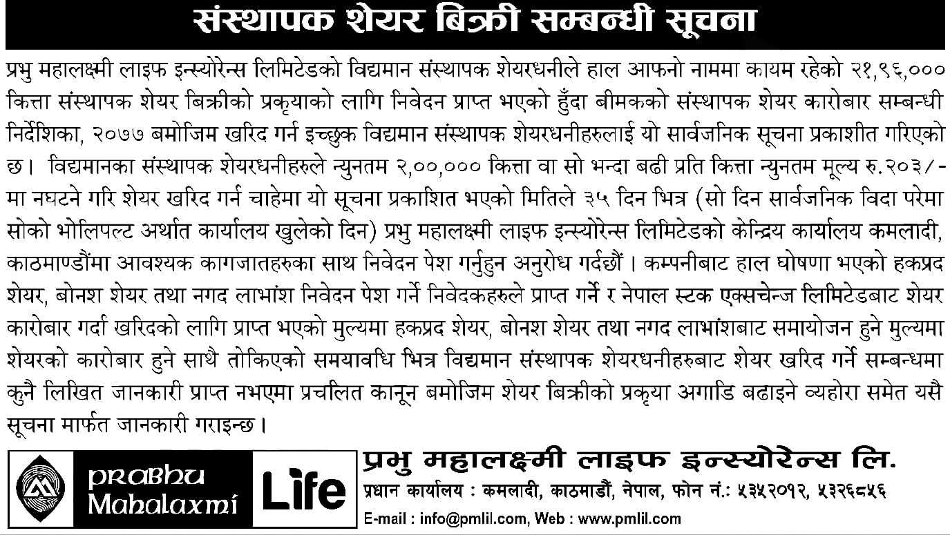 काठमाडौं । प्रभु महालक्ष्मी लाइफ इन्स्योरेन्स लिमिटेडले संस्थापक सेयर बिक्रीमा राखेको छ । कम्पनीले संस्थापक सेयरधनीको नाममा रहेको २१ लाख ९६ हजार कित्ता सेयर बिक्रीमा राखेको हो ।