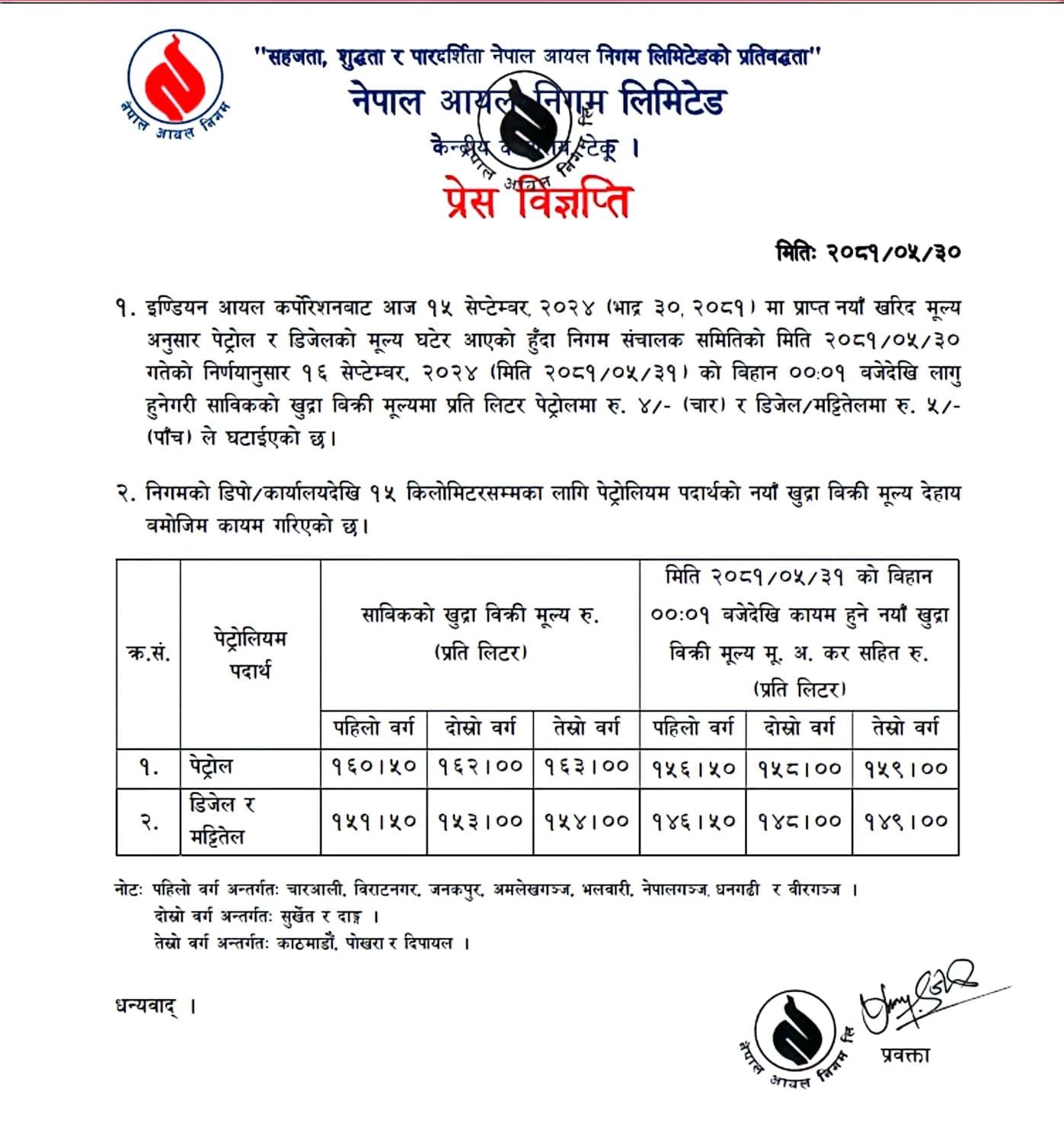 नयाँ मूल्य अनुसार काठमाडौं उपत्यकामा पेट्रोलको मूल्य १५९ रुपैयाँ पर्नेछ । डिजेल र मट्टितेलमा १४९ रुपैयाँ मूल्य निर्धारण गरिएको छ । यो मूल्य तेस्रो वर्ग अन्तर्गत पर्ने पोखरा र दिपायलमा समेत लागु हुनेछ ।