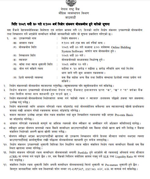 यसका लागि आज अपराह्न ३ बजे बोलकबोल हुने राष्ट्र बैंकले जनाएको छ। निक्षेप दिन चाहने बैंक तथा वित्तीय संस्थाले घटीमा १० करोड रुपैयाँ र बढीमा ५ करोड रुपैयाँले भाग गर्दा निःशेष भाग जाने गरी कुल आह्वान रकमसम्म बोलकबोल गर्न सक्नेछन्।