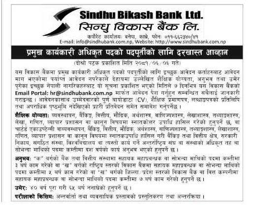 सिन्धु विकास बैंकको सीईओका लागि पुनः दरखास्त आह्वान