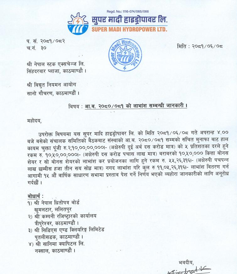 काठमाडौं । सुपर मादी हाइड्रोपावर कम्पनीले लाभांश घोषणा गरेको छ । मंगलबार बसेको कम्पनी सञ्चाल समितिको बैठकले गत आवको नाफाबाट लाभांश घोषणा गरेको हो ।