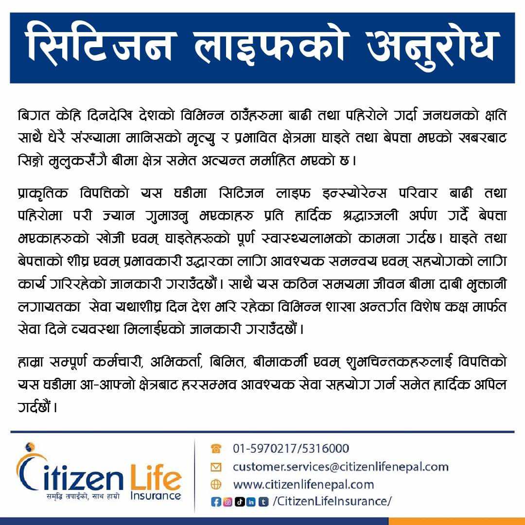 विगत केही दिनदेखि देशका विभिन्न स्थानमा बाढी तथा पहिरोले गर्दा जनधनको क्षतिका साथै धेरै संख्यामा मानिसको मृत्यु र प्रभावित क्षेत्रमा घाइते तथा बेपत्ता भएको खबरबाट सिंगो मुलुकसँगै बीमा क्षेत्रसमेत अत्यन्त मर्माहित भएको कम्पनीले उल्लेख गरेको छ । प्राकृतिक विपत्तिको यस घडीमा सिटिजन लाइफले बाढी तथा पहिरोमा परी ज्यान गुमाएकाहरुप्रति हार्दिक श्रद्धाञ्जली अर्पण गर्दै बेपत्ताहरुको खोजी एवं घाइतेहरुको पूर्ण स्वास्थ्यलाभको कामना गरेको छ । घाइते तथा बेपत्ताको शीघ्र एवं प्रभावकारी उद्धारका लागि आवश्यक समन्वय एवं सहयोगका लागि कार्य गरिरहेको पनि कम्पनीले जनाएको छ ।