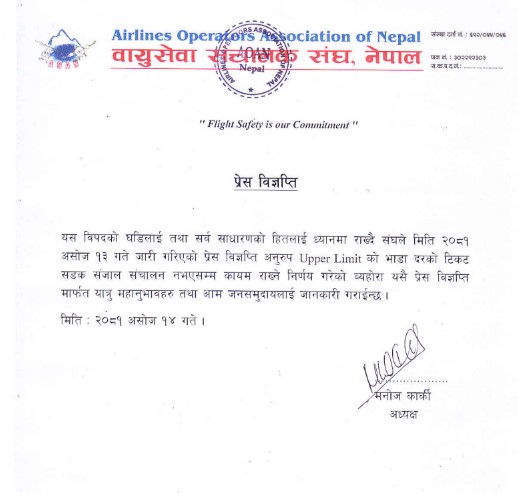 काठमाडौं । विमान कम्पनीहरूले सडक सञ्जाल सञ्चालन नहुँदासम्म उच्च भाडादरमा टिकट नबेच्ने भएका छन् । वायुसेवा सञ्चाक संघ, नेपालले सोमबार विज्ञप्ति जारी गरेर विपद्को घडीमा सरकारले तोके बमोजिमको अपर लिमिट (उच्च भाडादर) मा नै टिकट नबेच्ने निर्णय गरेको हो ।