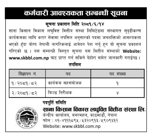 काठमाडौं । साना किसान विकास लघुवित्त वित्तीय संस्था लिमिटेडले कर्मचारी माग गरेको छ । कम्पनीले सोमबार एक सूचना प्रकाशित गर्दै कार्यक्रम सहसंयोजक र फिल्ड निरीक्षक पदमा ५ जना कर्मचारी माग गरेको हो ।