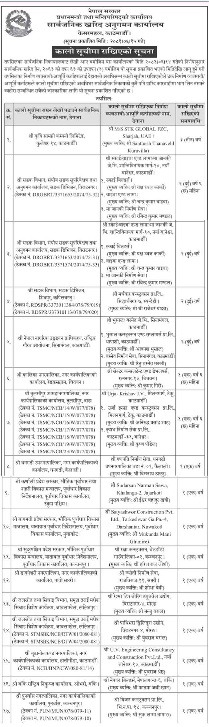 सार्वजनिक खरिद ऐन, २०६३ को दफा ६३ को उपदफा (१) बमोजिम सूचना प्रकाशित भएको मितिदेखि लागू हुने गरी विभिन्न २१ निर्माण व्यवसायी तथा आपूर्ति कर्तासँग कुनै कारोबार नगर्न सूचनामार्फत आग्रह गरिएको हो ।