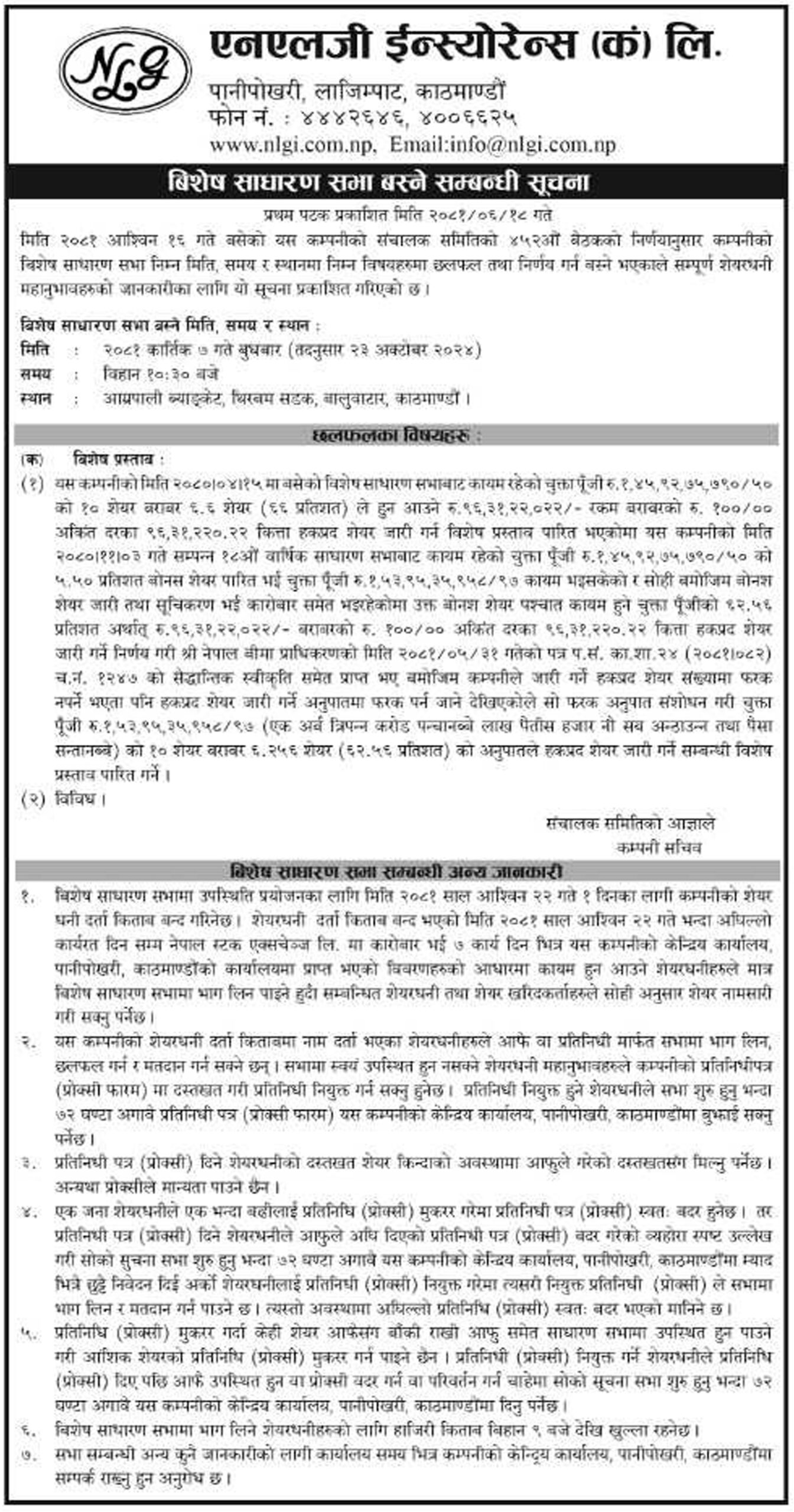 एनएलजी इन्स्योरेन्सले बोलायो विशेष साधारणसभा कात्तिक ७ गते, हकप्रद प्रस्ताव पारित गर्ने
