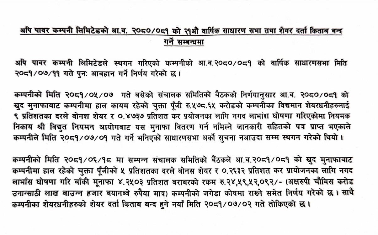 कम्पनीले लाभांश संशोधन गरेर वार्षिक साधरण सभा र बुक क्लोजको नयाँ मिति तय गरेको छ । कम्पनीले आगामी कात्तिक ११ गते वार्षिक साधारण सभा बोलाएको छ । जसका लागि कात्तिक २ गते बुकक्लोज निर्णय गरेको छ । यसअघि कम्पनीले प्रस्ताव गरेको लाभांश विद्युत नियमन आयोगले स्वीकृत नगरेपछि कात्तिक १ गते बोलाइएको साधारण सभा स्थगित भएको थियो ।