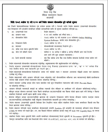 बैंकहरुले त्यसरी राखेको निक्षेपको ब्याजदर भने बोल कबोलका माध्यमबाट निर्धारण हुनेछ । अर्थात् सबैभन्दा थोरै ब्याजदर कबोल गर्ने बैंक तथा वित्तीय संस्थाको निक्षेप राष्ट्र बैंकले स्वीकार गर्ने राष्ट्र बैंकले जनाएको छ ।