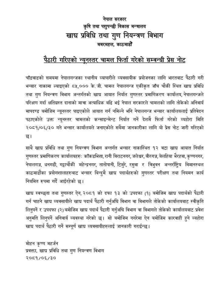 परीक्षण गर्दा चामलमा क्षतिग्रस्त दानाको मात्रा धेरै (न्यूनस्तर) पाइएपछि भारतमै फिर्ता गरिएको खाद्य प्रविधि तथा गुण नियन्त्रण विभागका प्रवक्ता मोहनकृष्ण महर्जनले जानकारी दिए ।