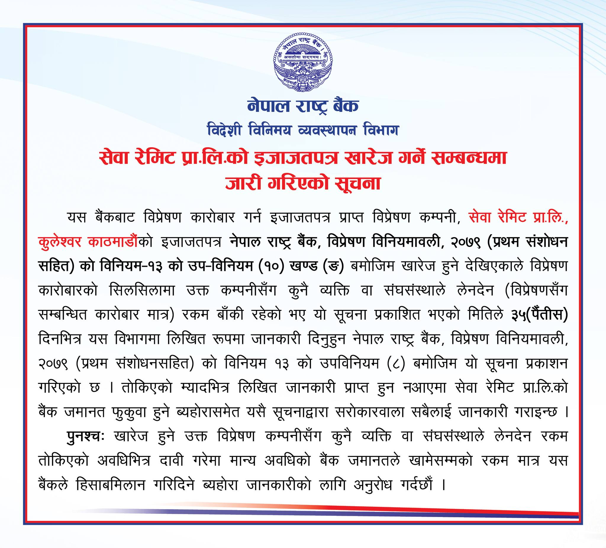 नेपाल राष्ट्र बैंक, विप्रेषण विनियमावली, २०७९ बमोजिम खारेज हुने देखिएकाले विप्रेषण कारोबारको सिलसिलामा सो कम्पनीसँग कुनै पनि व्यक्ति वा संस्थाले लिन बाँकी रहेको भए जानकारी दिन केन्द्रीय बैंकले जनाएको छ ।